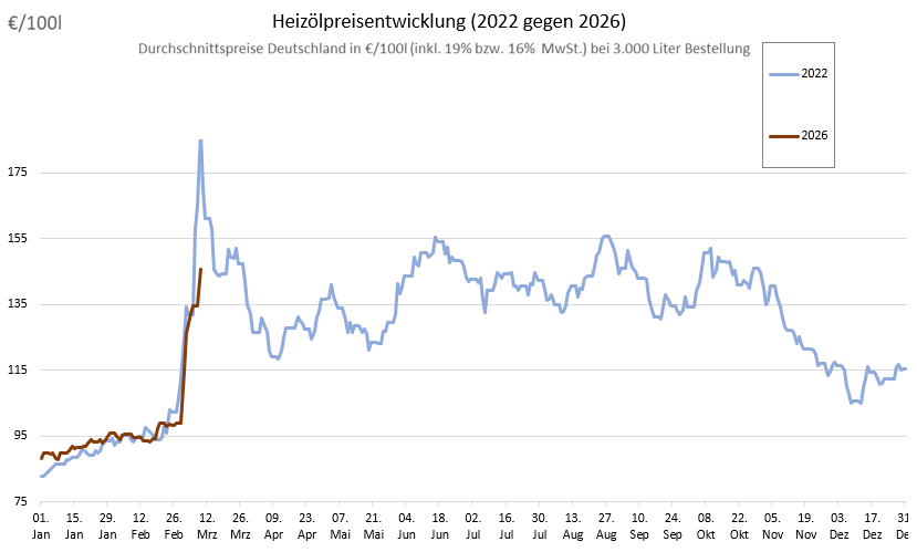 Betrachten wir die längerfristige Preisentwicklung, zeichnet sich das Ausmaß der aktuellen Heizölpreis-Anstiege mittlerweile sehr deutlich ab. So zahlen Käufer von Heizöl derzeit +56,61 Euro mehr als vergangenen Dezember, entsprechend Aufschlägen von +63,7 Prozent. Blicken wir auf die vergangenen Jahre, stieg der Preis des Heizmittels im Vergleich zu Anfang März 2025 um +51,79 Euro, und auch gegenüber März 2024 stiegen die Kosten um mittlerweile +42,28 Euro, bzw. +41,0 Prozent.
