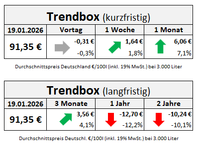 Die schlimmsten Anspannungen zwischen den USA und dem Iran scheinen sich aktuell zu beruhigen. Dadurch werden die Lieferrouten im Nahen Osten wieder als sicherer eingestuft, was den Rohölpreis und damit die Ölproduktpreise sinken lässt.