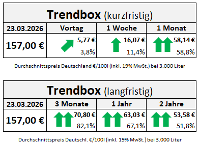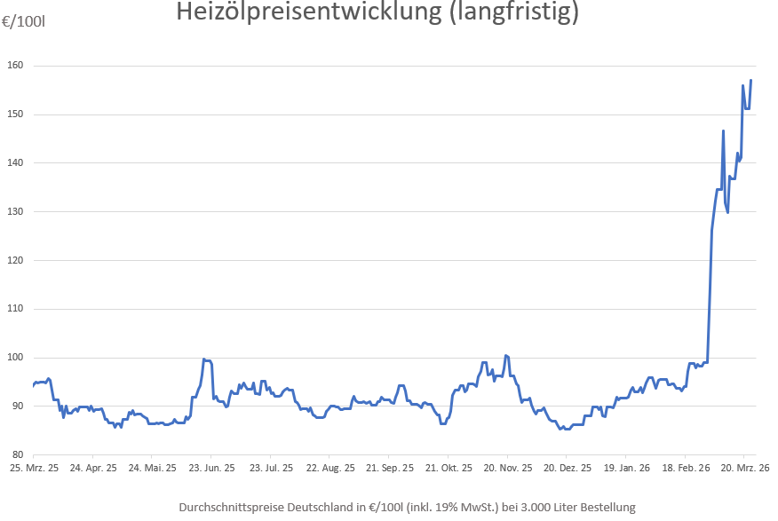 Die anhaltenden Unsicherheiten an den Weltmärkten treiben die Ölpreise weiter nach oben und scheinen sobald nicht abzureißen. Politische Spannungen und Versorgungsängste ließen die Preise seit Freitag um +5,77 Euro bzw. +3,8 Prozent ansteigen. Verglichen mit vor einer Woche stiegen die Kosten beim Kauf von Heizöl in Deutschland um durchschnittlich +16,07 Euro. Im Vergleich zu vor einem Monat, als die USA und der Iran vor Kriegsbeginn ihre Atomverhandlungen intensivierten, werden derzeit Preisanstiege von insgesamt +58,14 Euro bzw. +58,8 Prozent gemeldet.