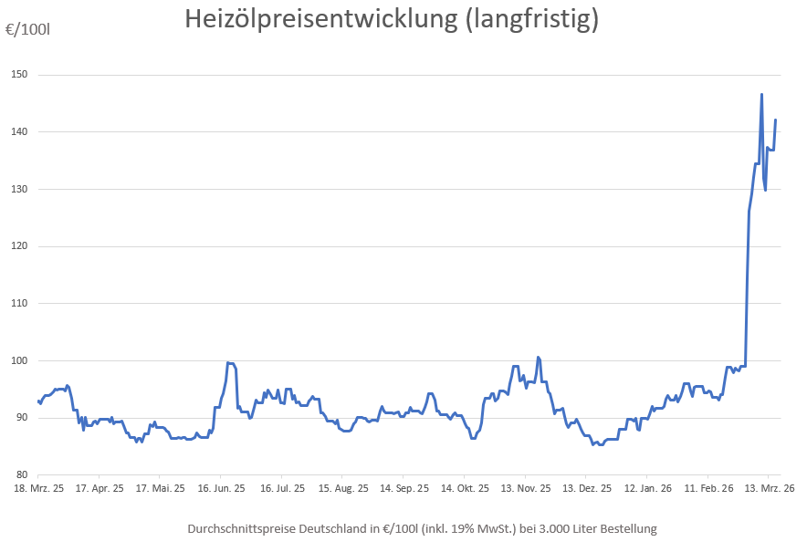 Auf längere Sicht wird nochmal deutlich, wie stark die aktuellen Preisanstiege entgegen der sonstigen Entwicklungen verlaufen. Verglichen mit der zuletzt günstigsten Saison, Ende 2025, zahlen Abnehmerinnen und Abnehmer derzeit +56,77 Euro mehr pro 100 Liter Heizöl in Deutschland. Und auch die Vorjahresvergleiche zeigen die derzeit erheblich höheren Heizölpreise, mit aktuellen Preisen von durchschnittlich +49,68 Euro mehr als im März 2025, und +37,77€ Aufschlag gegenüber Mitte März 2024.